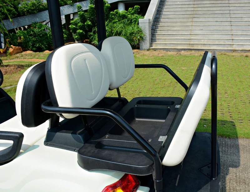 - Golfers have an option of the ECAR exclusive 3-way rear seat. (golf bag holder, seat and flat cargo deck on gas lift heavy duty struts)